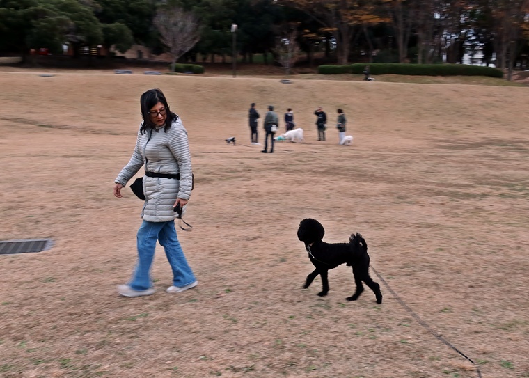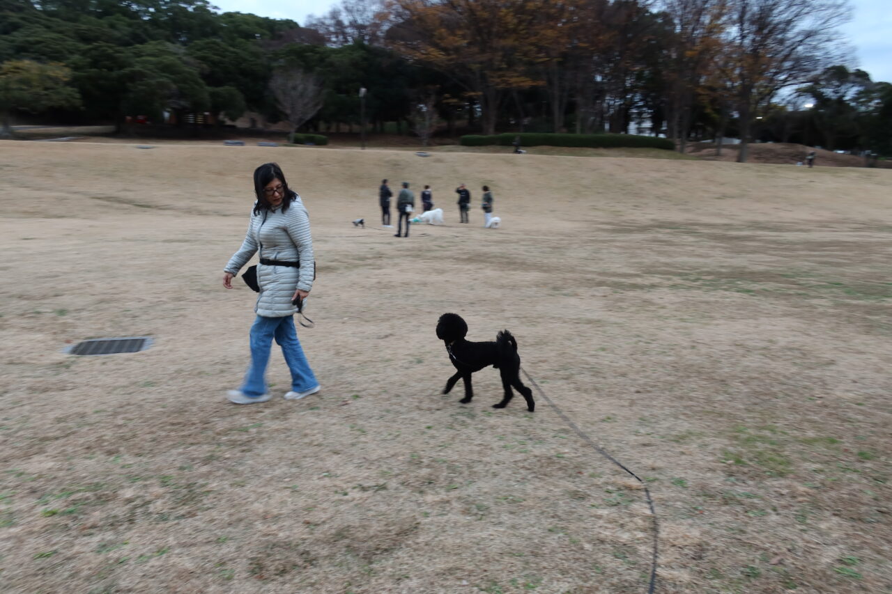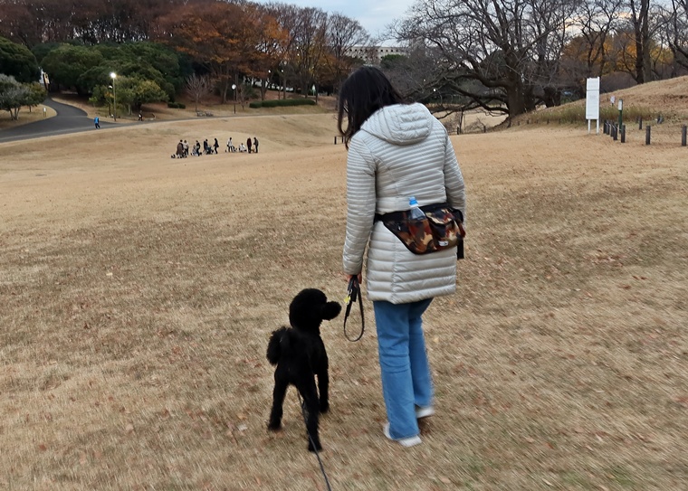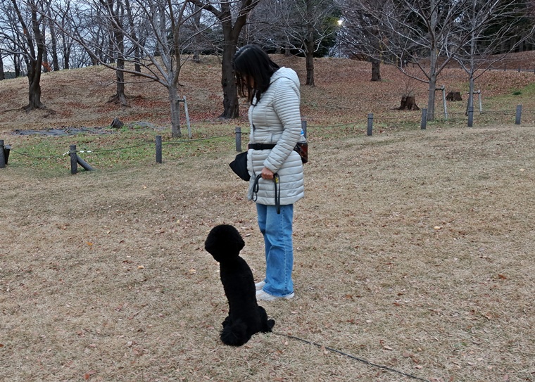 今日のインディ君のレッスンは、夕方からのお散歩トレーニングです。前回の「Sit/Stay」で一旦停止し、相手の犬をやり過ごすトレーニングの確認と、公園内でロングリードを使用して飼い主さんのコマンドを優先できるようにするトレーニングを行いました。