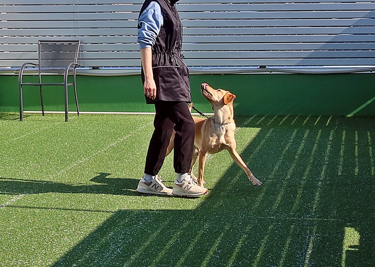 脚側行進の屈折時の同調性を高める為のトレーニングは、丁寧に1つ1つの動作を関連づけていきましょう。伏臥の反応速度と方向性に関しても引き続き一貫したトレーニングが必要ですが、モチベーターを使う場合に、指導手の動きや気持ちを先読みされている状況ですので、遊びを含めて、イニシアティブを握れる関係性を今後も突き詰めていく必要があります。