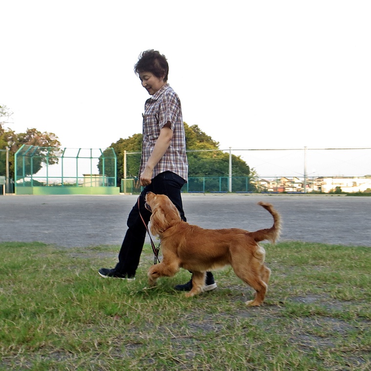 「Heel」のコマンドの意味の理解を飼い主さんに再確認して頂き、現状のトレーニングの方法の改善点などを含めた実践トレーニングを行いました。また、このコマンドを実行させる際に、地質の変化だけでも、どの程度の誘惑刺激としての影響が、かのんちゃんにもたらされるのか?も体感して頂きました。