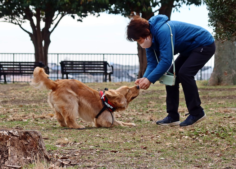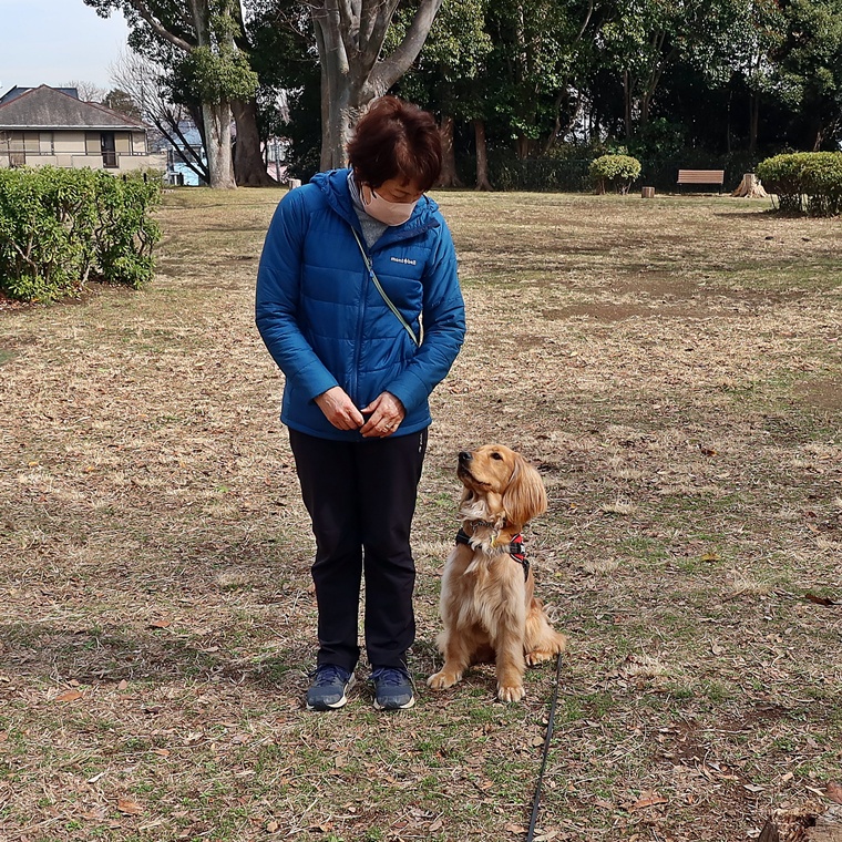 前回のレッスンでも改善をお願いしたトリーツの使い方や与えるタイミングの改善に関しては、かなり気を使われているようですが、全くトリーツを使わないと言う事ではなく、期待感と達成感のある与え方を考えるようにしていきましょう。今回の「ヒール」のコマンドも、今までは、トリーツが先行した誘導で行っていましたので、左手を追いかける習慣がついていました。