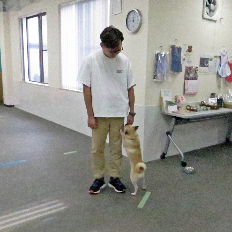 飛びついた行動に対して、中途半端に声に出したり体を動かすことをせずに無言でフリーズし、こむぎちゃんが座った瞬間をタイミングよく誉め、アイコンタクトが出来たら再度、誉めてからトリーツを与えるようにしていきましょう。トリーツを与える際の飛びつきも、レッスンで行ったように、正し行動を選択できるようにする事が必要です。