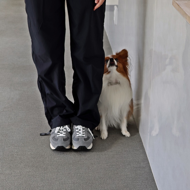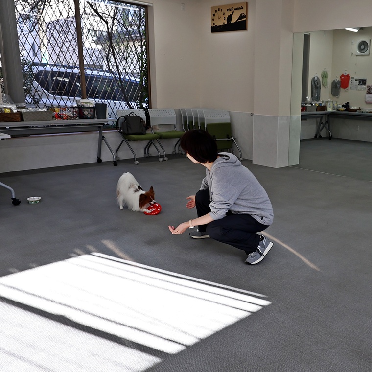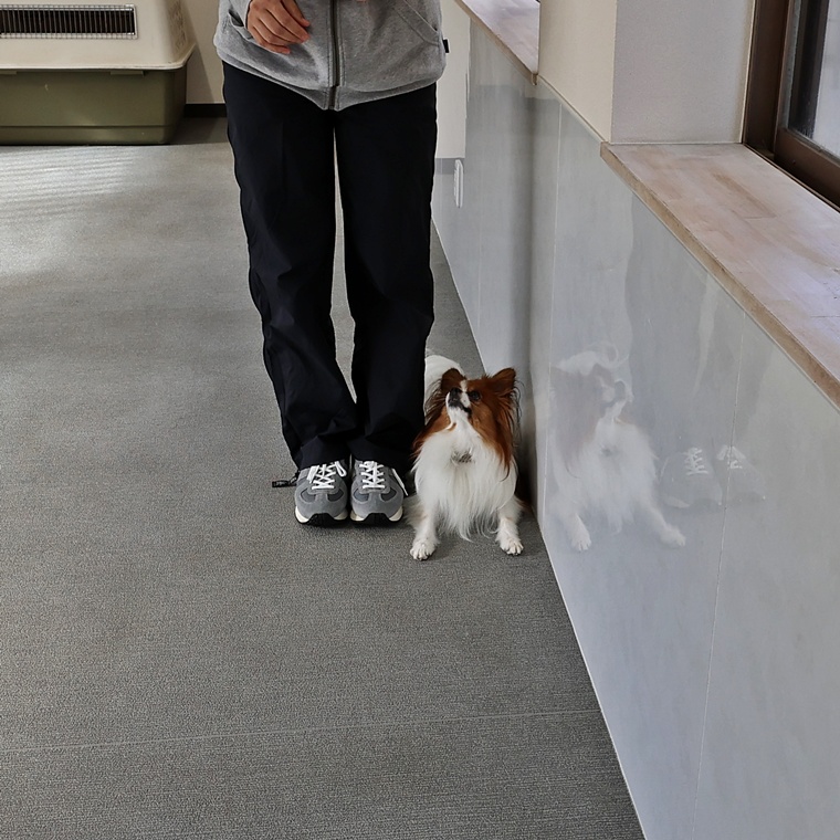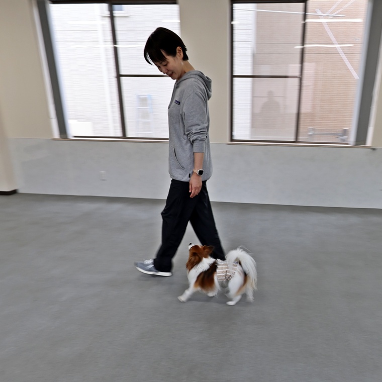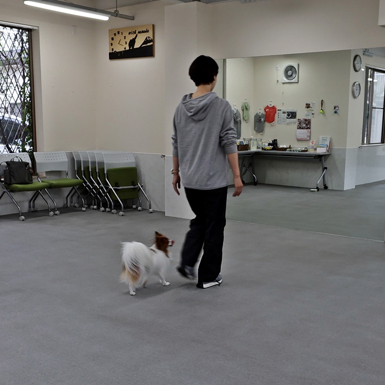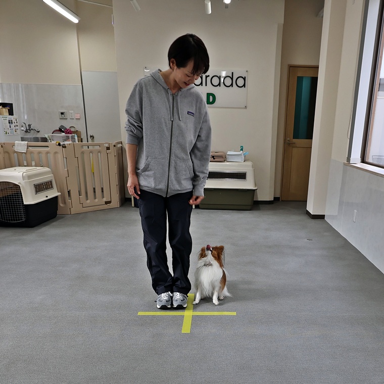 視覚的に、どこが正しいのか?まずは、飼い主さんが理解していく必要があります。床に目印をつけて、飼い主さん自身とレオ君のポジションを視覚的に捉えることや、トリーツの誘導からのステップでは、壁を利用する事も有効です。