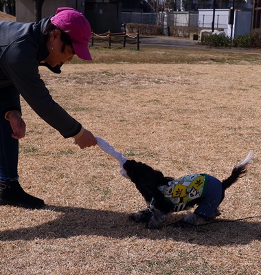 集中したトレーニングを効率よく行い、開放する事と誉めることを関連付けて飼い主さんから誉められることを最高の報酬にすべきですので、気持ちの切り替えを分りやすく行なえるようにして下さい。ボールのレトリーブの基本は、引っ張りっこから始めるとボールの保持やレトリーブに対する意欲の強化につながります。遊び方は表現力ですので、思いっきり負けてあげて下さい。