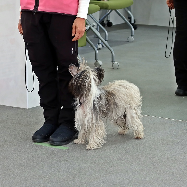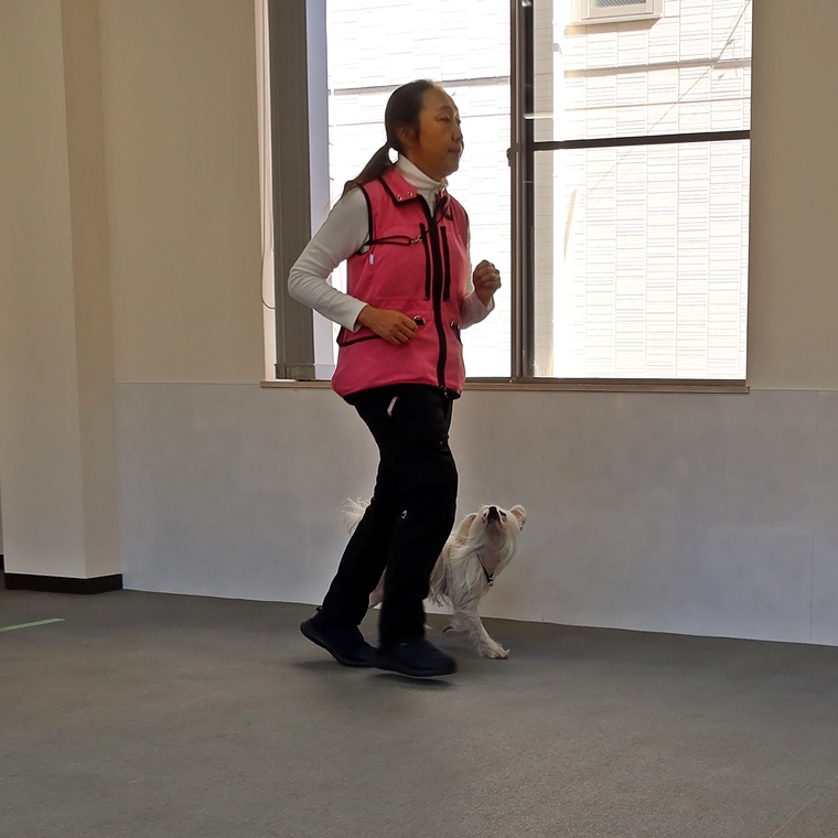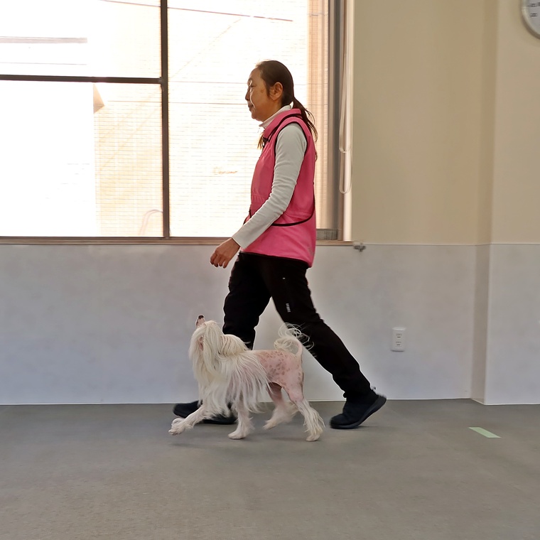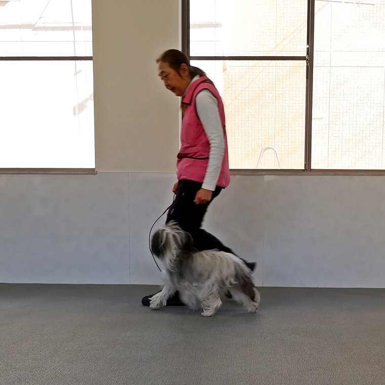 FIELDでしたので脚側行進も直線での左ターンと右ターンで行いました。脚側行進のステップアップを進めていますので、以前よりも姿勢にバラつきがありますので、一旦トレーニングレベルを下げるなどして調整をしていきましょう。招呼と伏臥・立止は問題なくクリアできていますので、現在取り組んでいる脚側停座の精度の向上を今後も続けていきましょう。