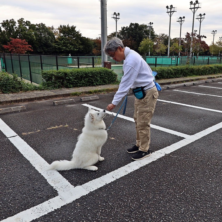 初レッスンとなったルーク君(サモエド5カ月半♂)は、今後のトレーニングを進める上での基本的な考え方のレクチャーを行い、飼い主さんのスキルアップを進めていて頂けるようにお話をさせて頂きました。また成長と共に気候もサモエドには動きやすくエネルギーを発散させたい意欲の高まる時期ですので、将来を見据えた基本的なコマンドのトレーニングを無理のないように進めていきましょう。