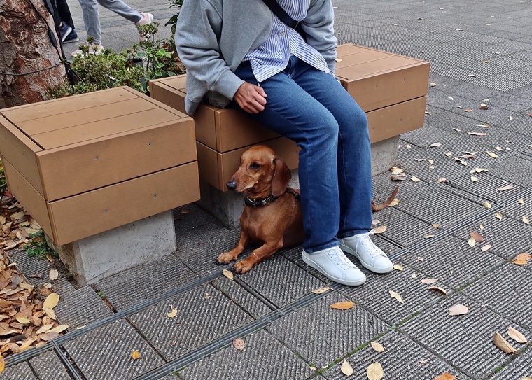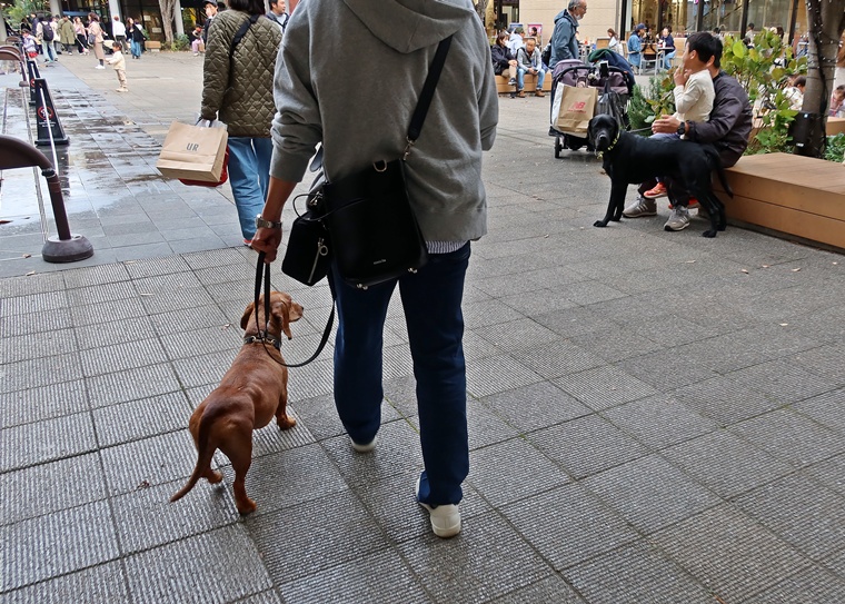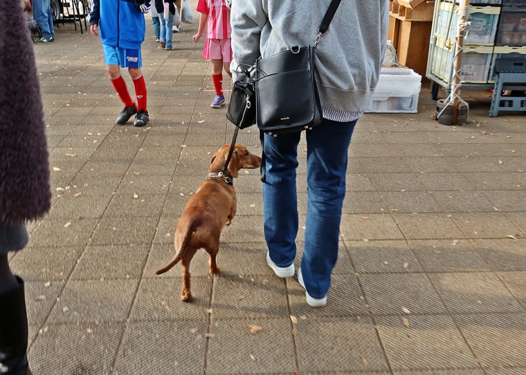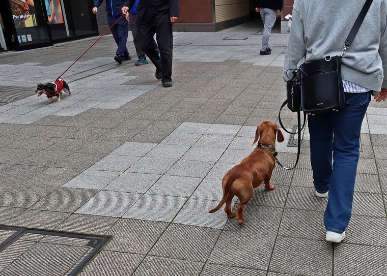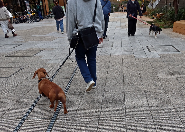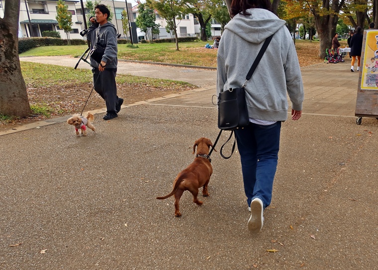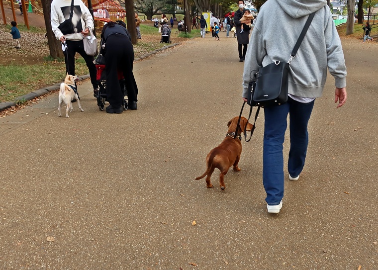この状態では、ルーク君の進む方向に飼い主さんが着いて行きますので、結果的にコマンドはルーク君に届かなくなります。「ゆっくり」のコマンドを出しながら、ルーク君の歩速に合わせるわけですから、「ゆっくり」は、飼い主さんがルーク君に着いて行くコマンドとなります。