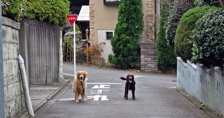 今日のマー君&ゲイリー君のレッスンは、昨日のアテンションコントロールでの「Stay」の修正と強化やお散歩中の「Stay」と「Sit」の徹底の確認です。