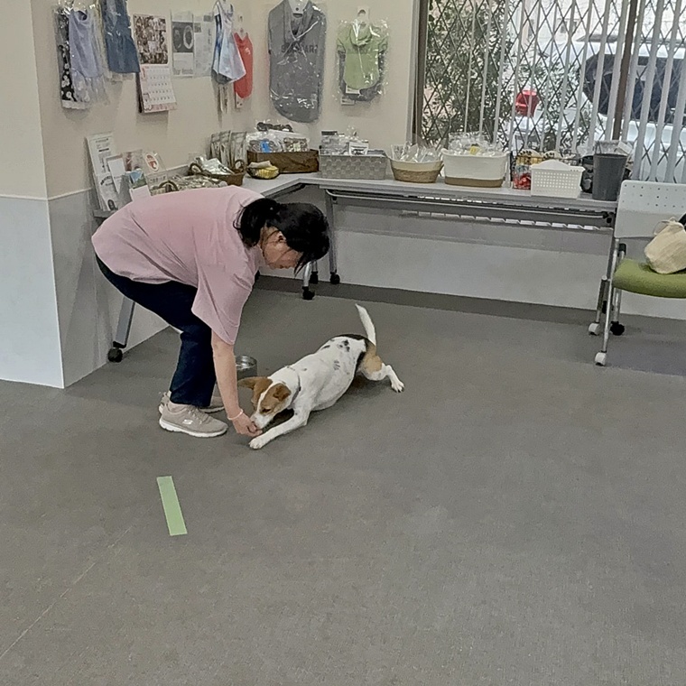 前回のレッスンで学んだ「伏せ」のコマンドは、マロン君自身はハンドシグナルだけでも実行できる理解になってきていますが、飼い主さんのトレーニングが、トリーツで誘導する対応からステップアップできていませんので、伏せの姿勢の維持よりもトリーツを追いかけて一瞬の伏せの姿勢になってしまっているようです。