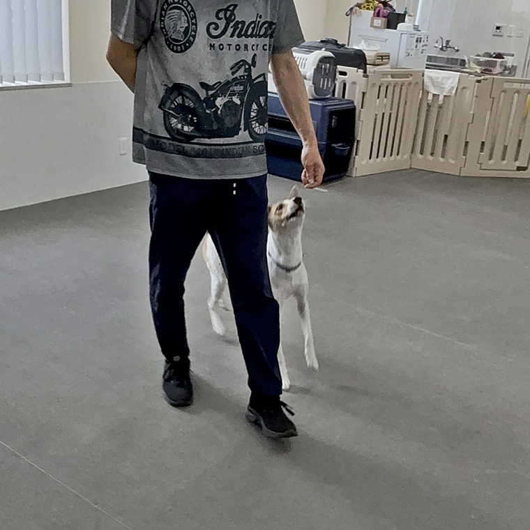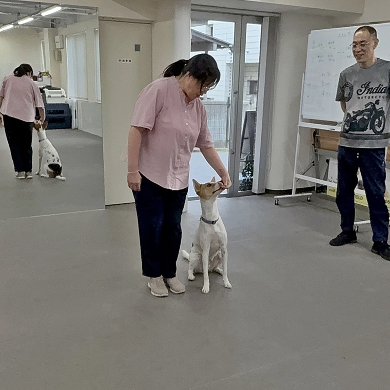 トレーニングの開始時よりも落ち着きと飼い主さんへの意識が強くなってきているようです。お散歩でも、以前のような他の犬への強い反応も減ってきているようですので、今後もご家族の中でのルールの取り決めと一貫した対応を心掛けながらトレーニングを進めていきましょう。