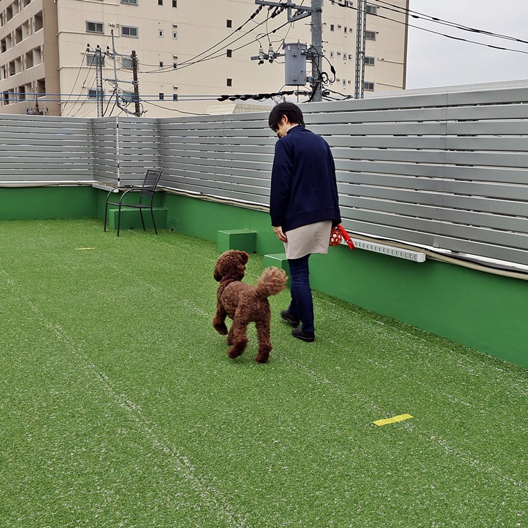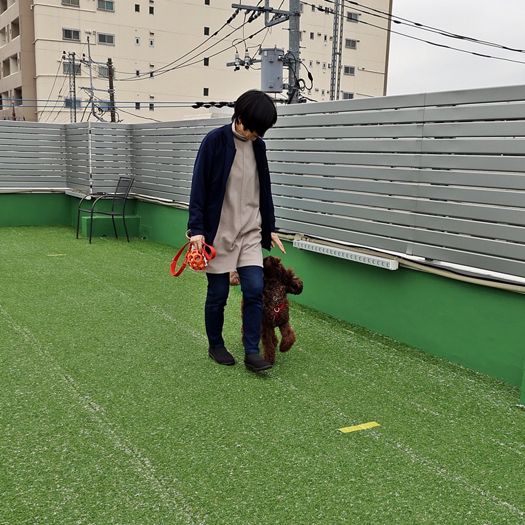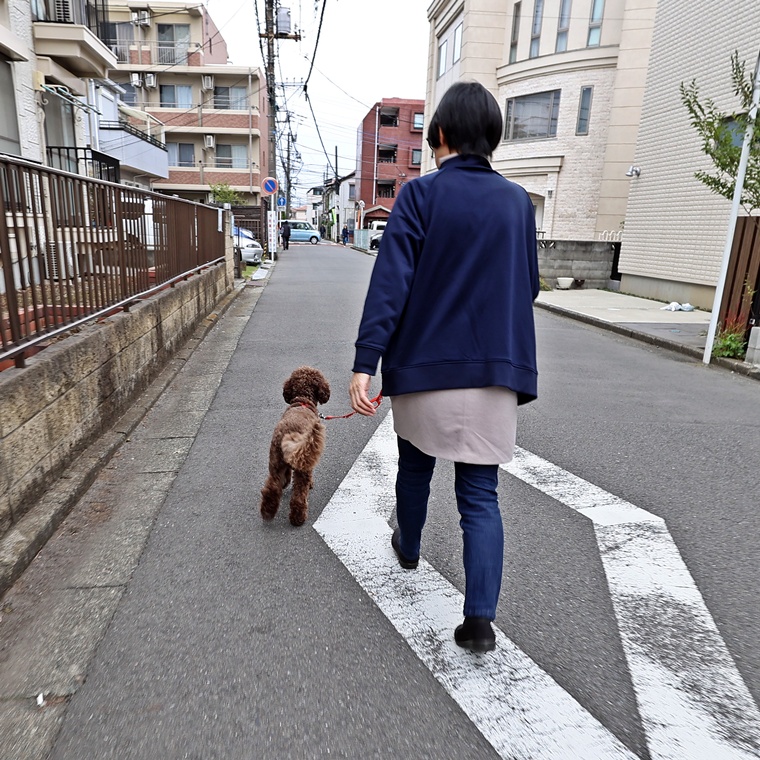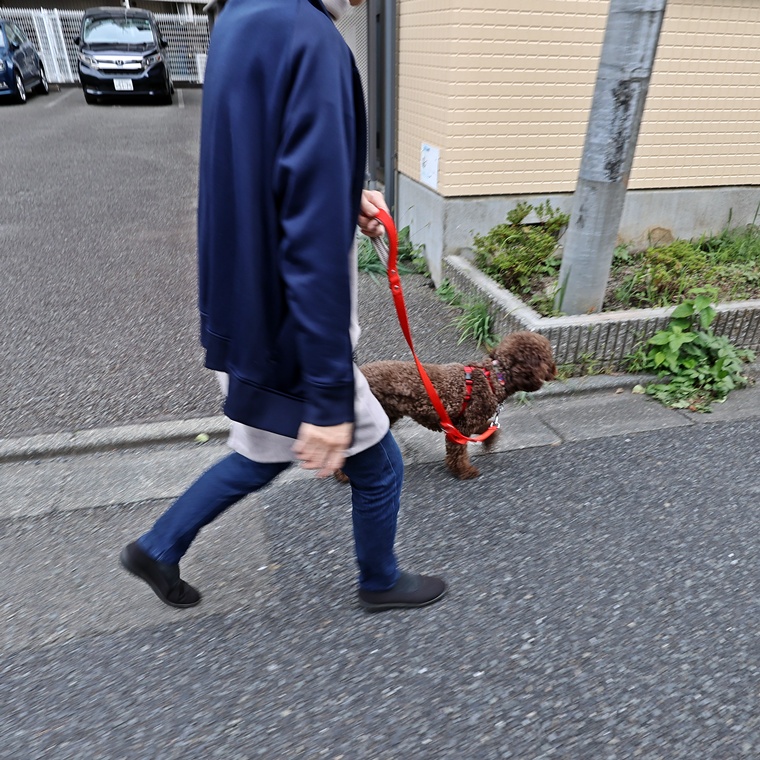 リードのコントロールではなく「ついて」のコマンドで飼い主さんの傍で歩けるかどうか?これは、まる君が「ついて」のコマンドをどの程度理解しているか?によります。