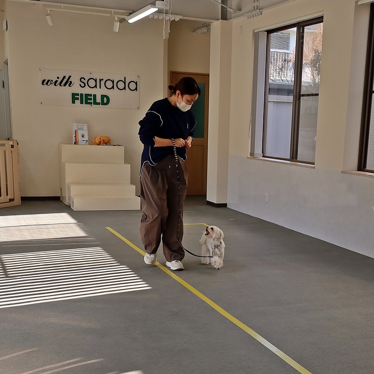 お散歩での引き癖や拾い食い、匂い嗅ぎなどが課題のなつめ君。まずは、FIELDで「Heel」のコマンドのトレーニングをしたのちに、屋外でのお散歩の実践トレーニングを行いました。
