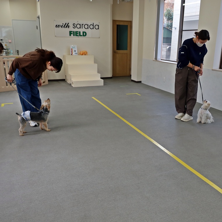 同じような課題のある、ちくわ君との合同トレーニングは、すれ違いと、その後の落ち着かせてからの挨拶のさせ方などを実践トレーニングしました。
