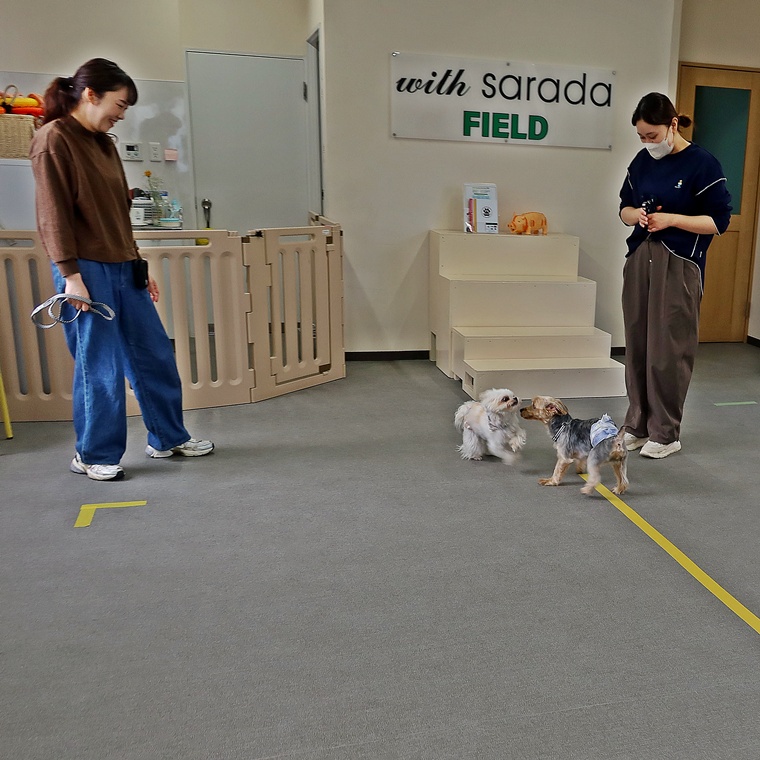2頭共に、他の犬との遊びが大好きなタイプですので、すれ違いの段階から大興奮でしたが、飼い主さんがシッカリコマンドを出してコントロールできるようになる事で、落ち着きも生まれます。相手との相性を確認する事が大前提ですが、飼い主さんのコマンドに従った報酬として遊べることにする事も充分に可能です。