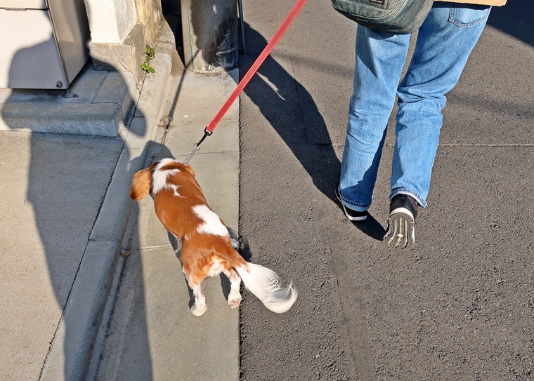 今日の扇ちゃんのレッスンは、お散歩トレーニングです。日頃のお散歩も以前より積極的に動けるようになってきたようですが、その分、引き癖が強くなっているとの事でしたので、現状の確認と対応のための実践トレーニングを行いました。