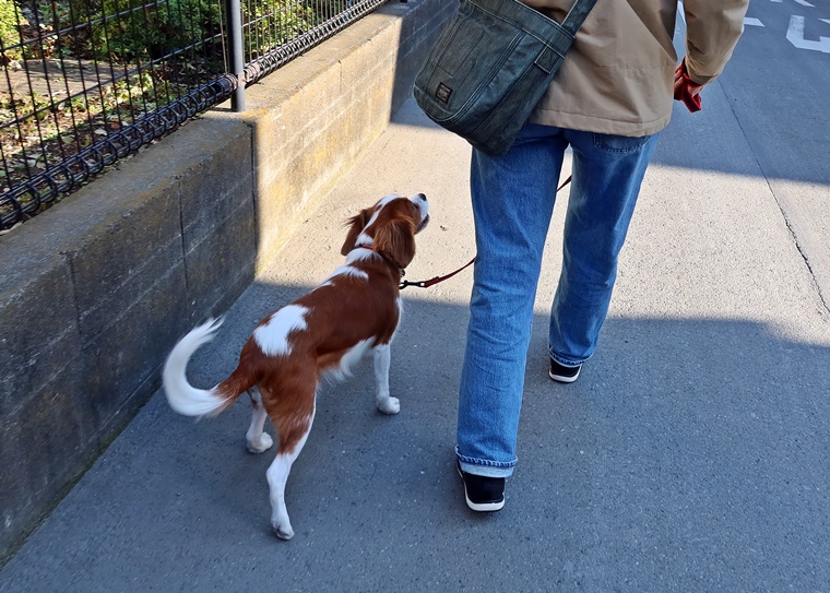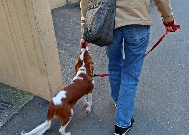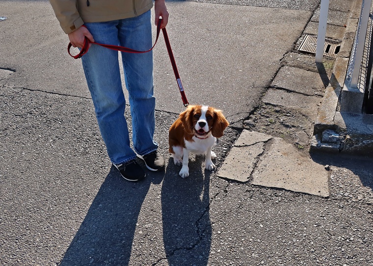 匂い嗅ぎが頻繁ですし、光るモノや動くモノに反応している場面も見られますので、飼い主さんが気を緩めると瞬間的に強く引かれてしまいます。お散歩の中で「ゆっくり」のコマンドは、匂いを嗅がないように歩くルールとして短い距離から取り組んでいきましょう。匂いを嗅いで良い区間に来たら一旦「お座り」で解除をして匂い嗅ぎがOKになります。屋外での「お座り」も、匂いが気になって中々できないようですので、確実に実行させるようにしていきましょう。