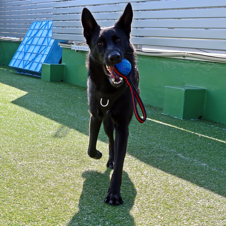 先日よりFIELDに馴れたこともあり、遊ぶことに対しての意欲も安定してきました。遊び方は、飼い主さんの課題ですので、大好きなオモチャで充分に運動を与えられるようにしていきましょう。また、現時点でのレトリーブのコマンドや呼び戻しのコマンドに実行性がありませんので、1つ1つのコマンドの見直しは急務です。遊びの中にも一定のルールと飼い主さんのイニシアティブの存在を確立ししていきましょう。