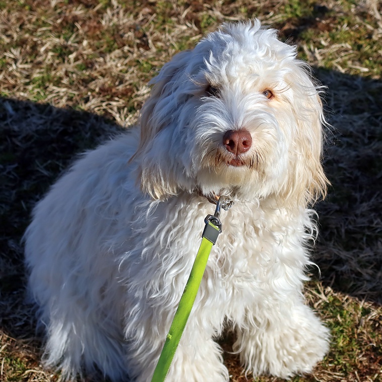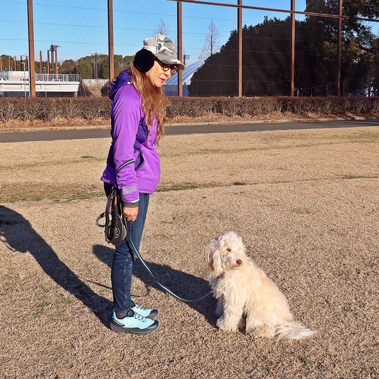シャンティ君が動き始めると、そこに飼い主さんが着いて行くスタイルを繰り返していくと、「動くか?動かないか?」「コマンドに従うか?無視するか?」の判断は、全てシャンティ君になります。今日のレッスンでも、アテンションとアイコンタクトのトレーニングの途中で、遊び相手が横を通過しました。