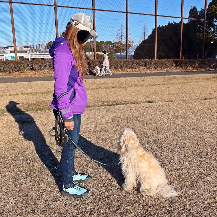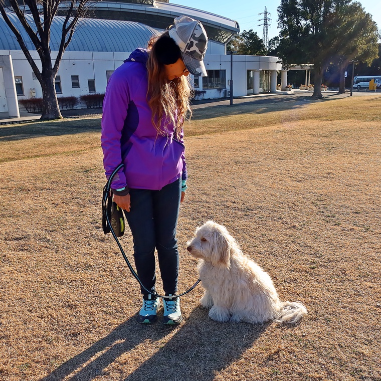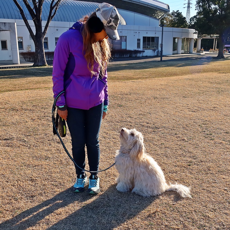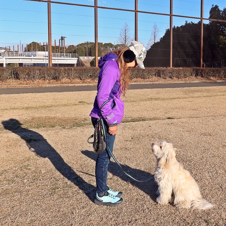 今日のレッスンでは、前回以降の飼い主さんの対応の変化と、それに対するシャンティ君の反応を確認しました。また、今後の基礎トレーニングの進め方についても、レクチャーと実践を行いました。