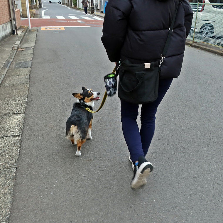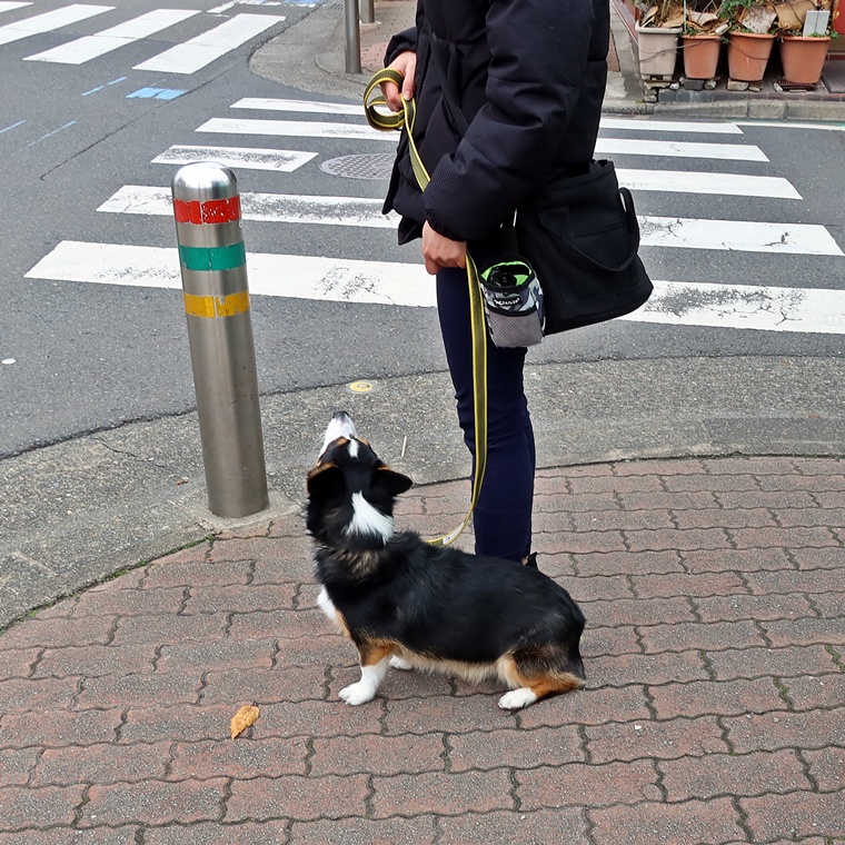 最初はリードが張り気味で前方への意識が強く、すれ違う人や自転車・車などに対しての反応も顕著でした。今回の基礎トレーニングは、しらすちゃんが自発的に飼い主さんへアイコンタクトをした瞬間をタイミングよく捉えて誉めるようにすることからスタートです。