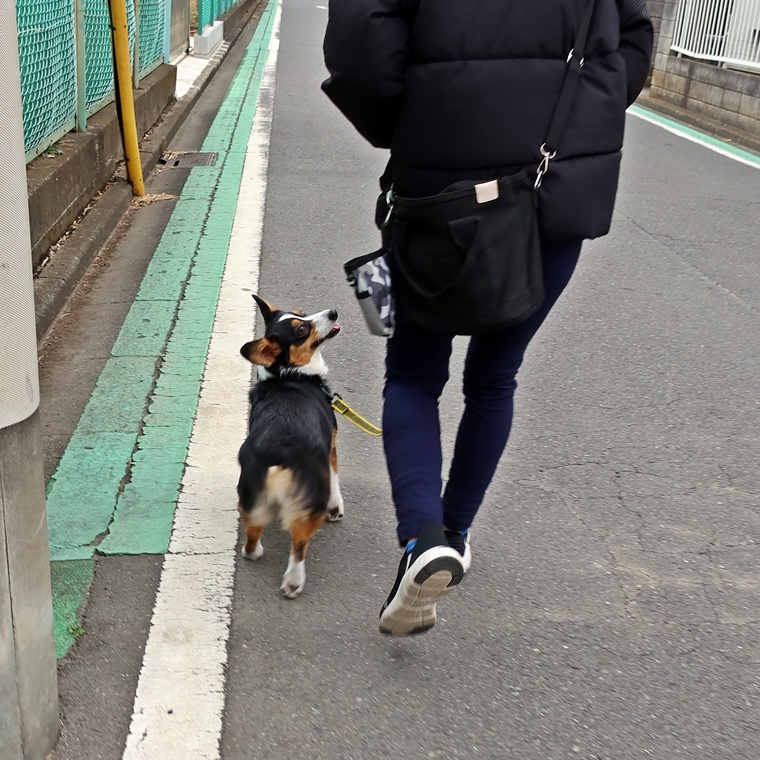 この一貫した対応とタイミングを逃さない飼い主さんの観察力で、しらすちゃんが、どこのポジションで歩くべきか?を理解するようになります。これにより、自然にリードはルーズになりますので、飼い主さんへの意識が高まる事と、環境刺激に反応した際も、すぐに飼い主さんへ意識が戻るようになります。