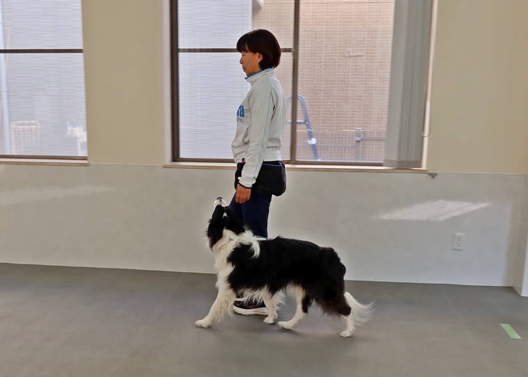 脚側停座の集中が維持できていると、とても良い脚側行進ができます。指導手の姿勢も改善されてきていますので、SOBA君の頭の位置が以前よりも前方に出れるようになっていますので、将来的に速歩の動きも同じポジションが維持できるようになります。現時点でのポジションの安定を今後も考えながらトレーニングをしていきましょう。