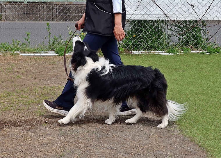 風が強く、指導手への集中が持続できない状況の中でのトレーニングでしたが、このような環境の変化にも対応できるように、普段から取り組んでみてください。前回までの課題の立止は、とてもスムーズにできるようになってきました。反面、伏臥の実行性が不安定ですので、バランスよくトレーニングをしていきましょう。日頃のトレーニングの際の指導手の視線と、レッスンでのトレーニングの視線が違う事も不安定な要因です。脚側行進の集中は良くなってきていますが、更に姿勢の維持ができるようにして下さい。行進中の伏臥は問題ありませんが、停座の実行性を安定させていきましょう。