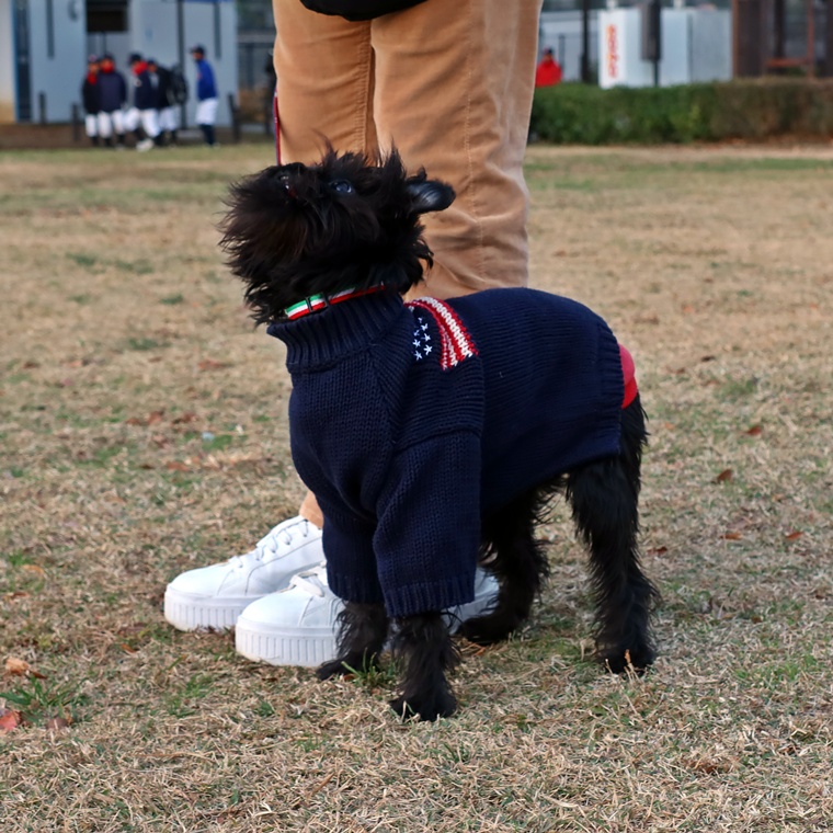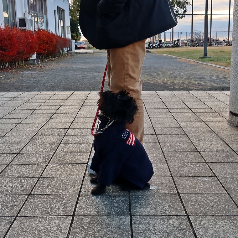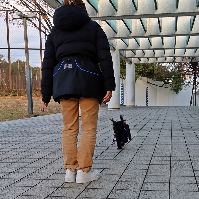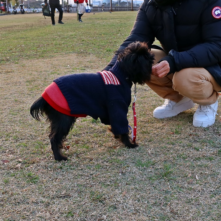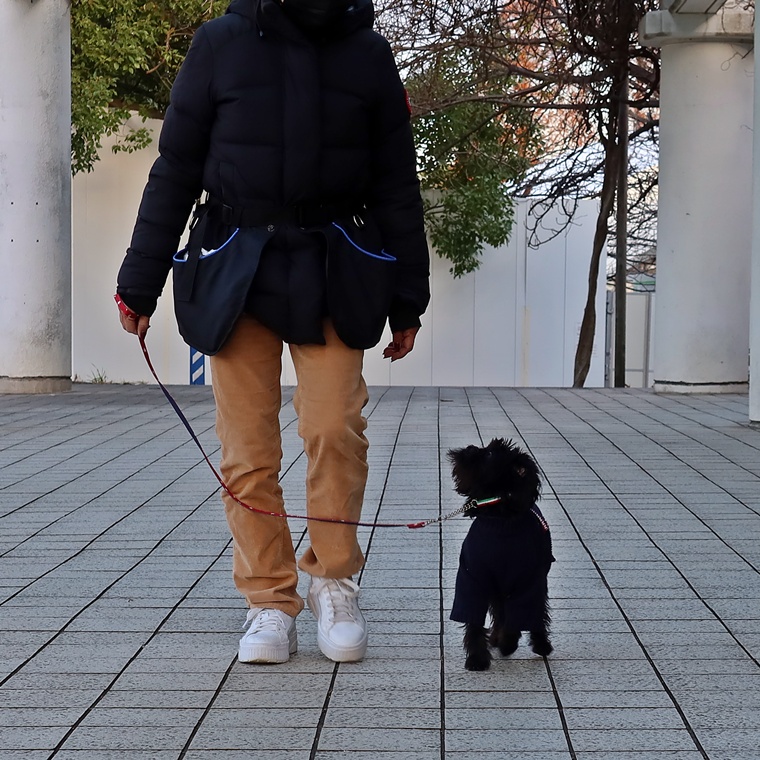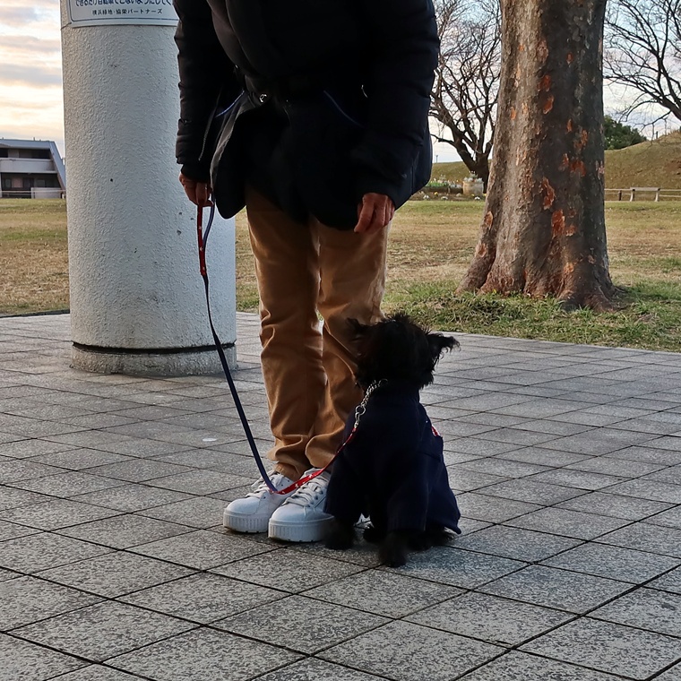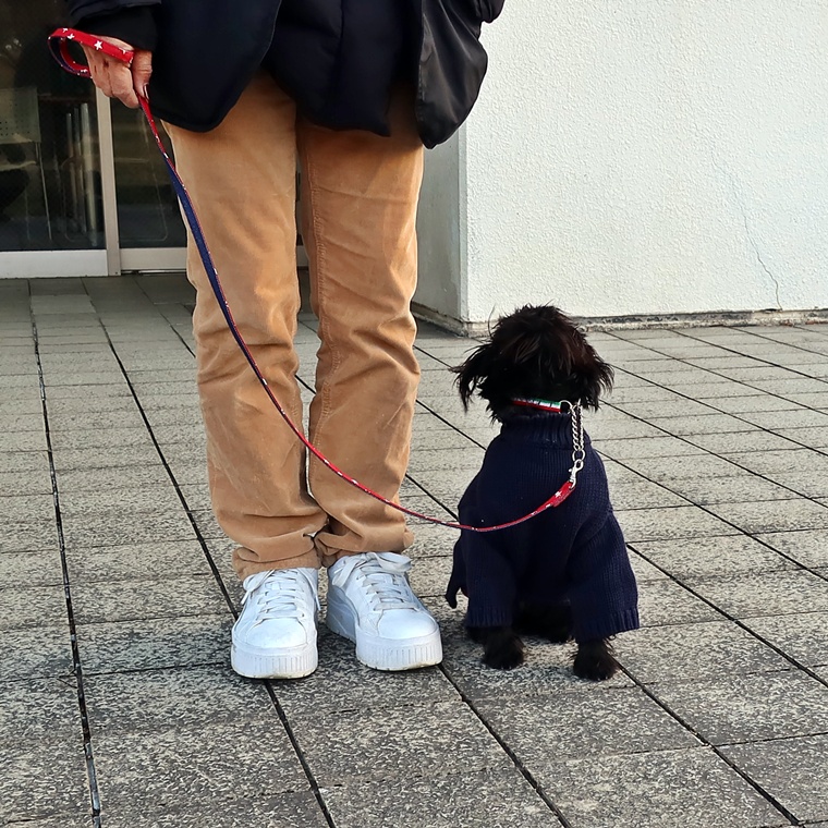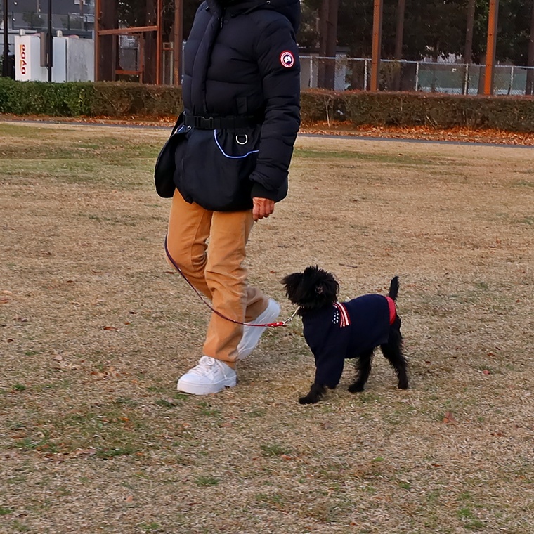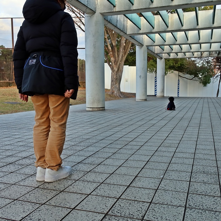 現時点で芝生の上でも指導手に集中して脚側停座が出来ていますが、無意識に指導手がうららちゃんのポジションに合わせてしまう傾向が見られましたので改善し、脚側停座の精度の向上をしていきましょう。