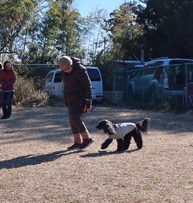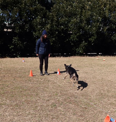 今回は、前回よりも距離や課目も増やしながら周りの刺激に左右されないように犬が指導手に集中できるようにコントロールして頂きました。