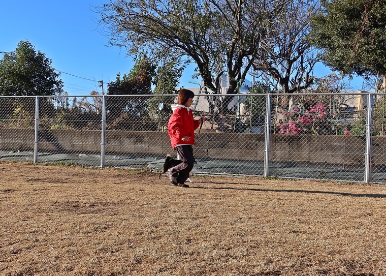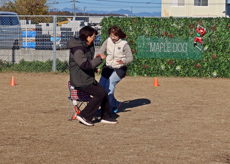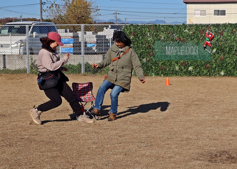 ルール:ぐるぐるバッドで3周してから20m先のメンバーにタッチ、次に縄跳び5回飛んで20m先のメンバーにタッチ、更にぐるぐるバッドで3週回り、20m先のメンバーにタッチ、縄跳びで5回飛んで20m先のメンバーにタッチして最後の人は、ダッシュ!全て、犬同伴なので、ぐるぐるバッドは、かなりふらつきます。(笑)