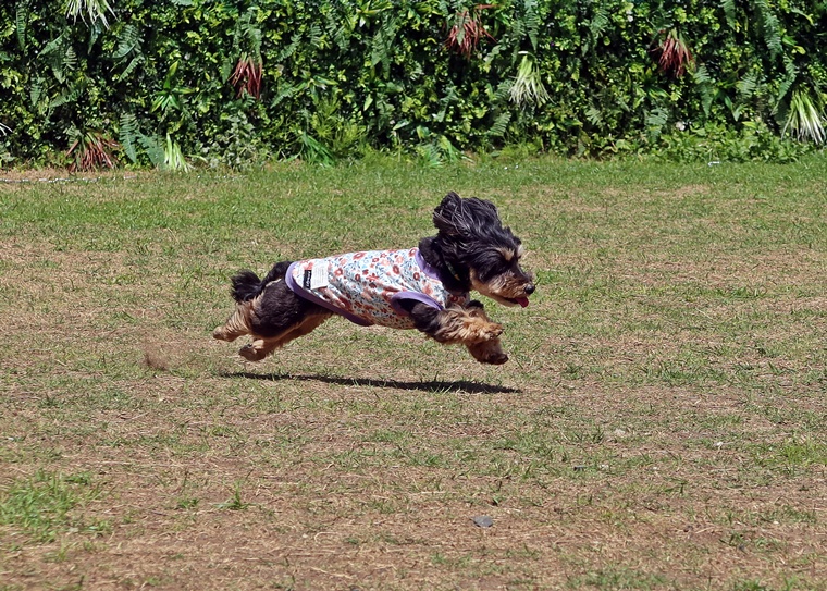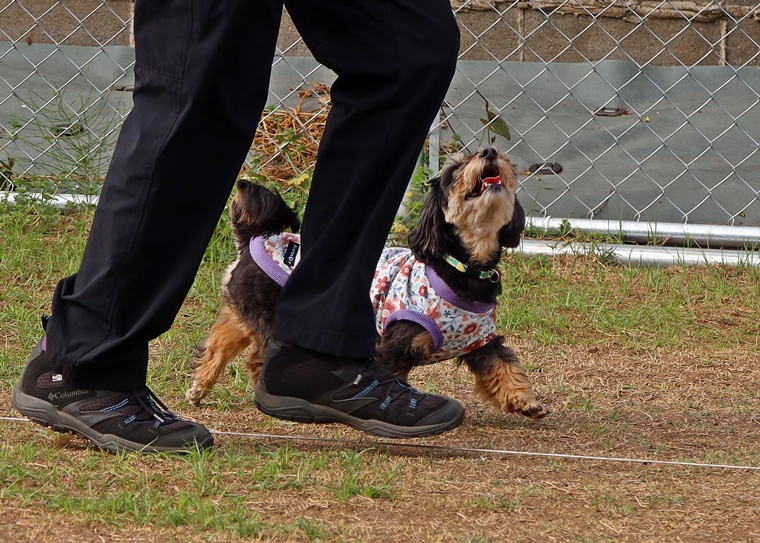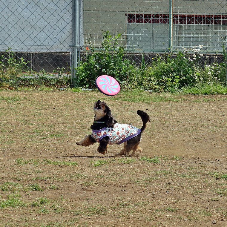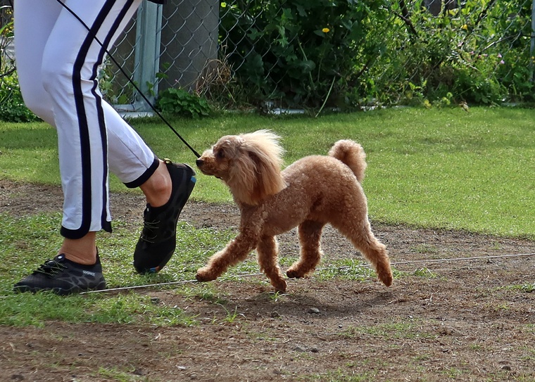 「待て」でハンドラーが30m離れ、30m先で呼び戻しタイムトライアルです。暑さの中、ハンドラーのハンドリングと走りの速さが勝敗を分けたようです。今回のゲームでは、小型犬に5mのハンディキャップを設けました。結果は・・・・。